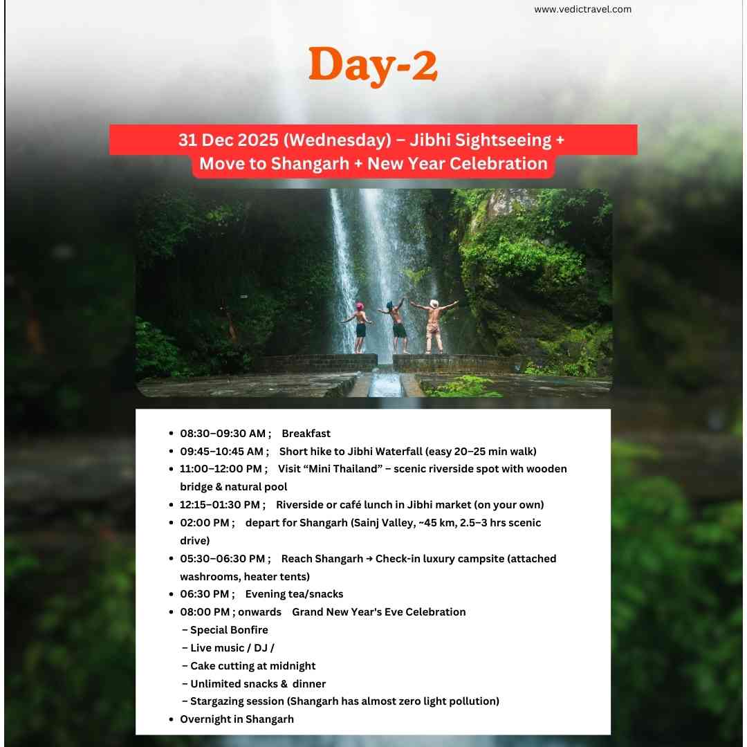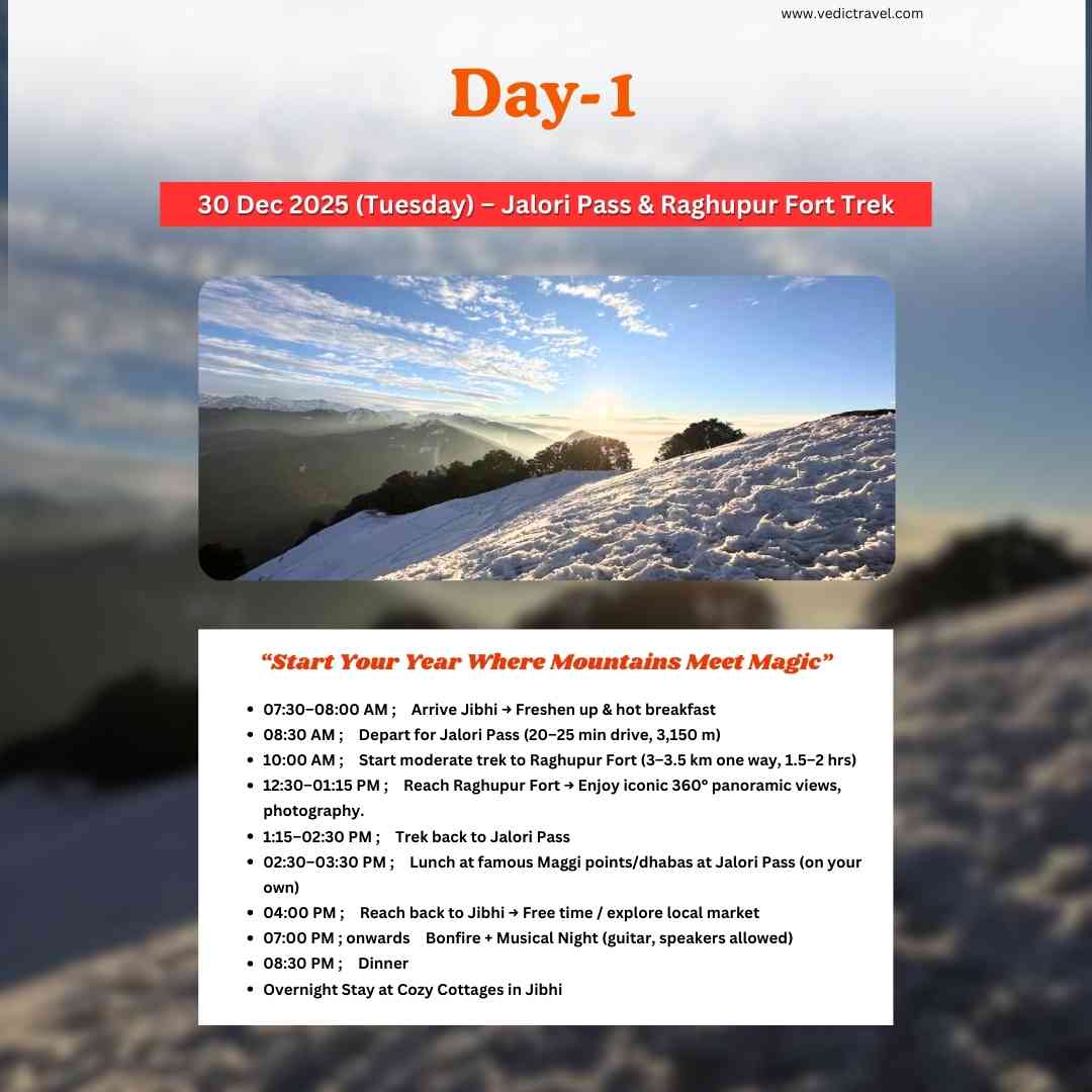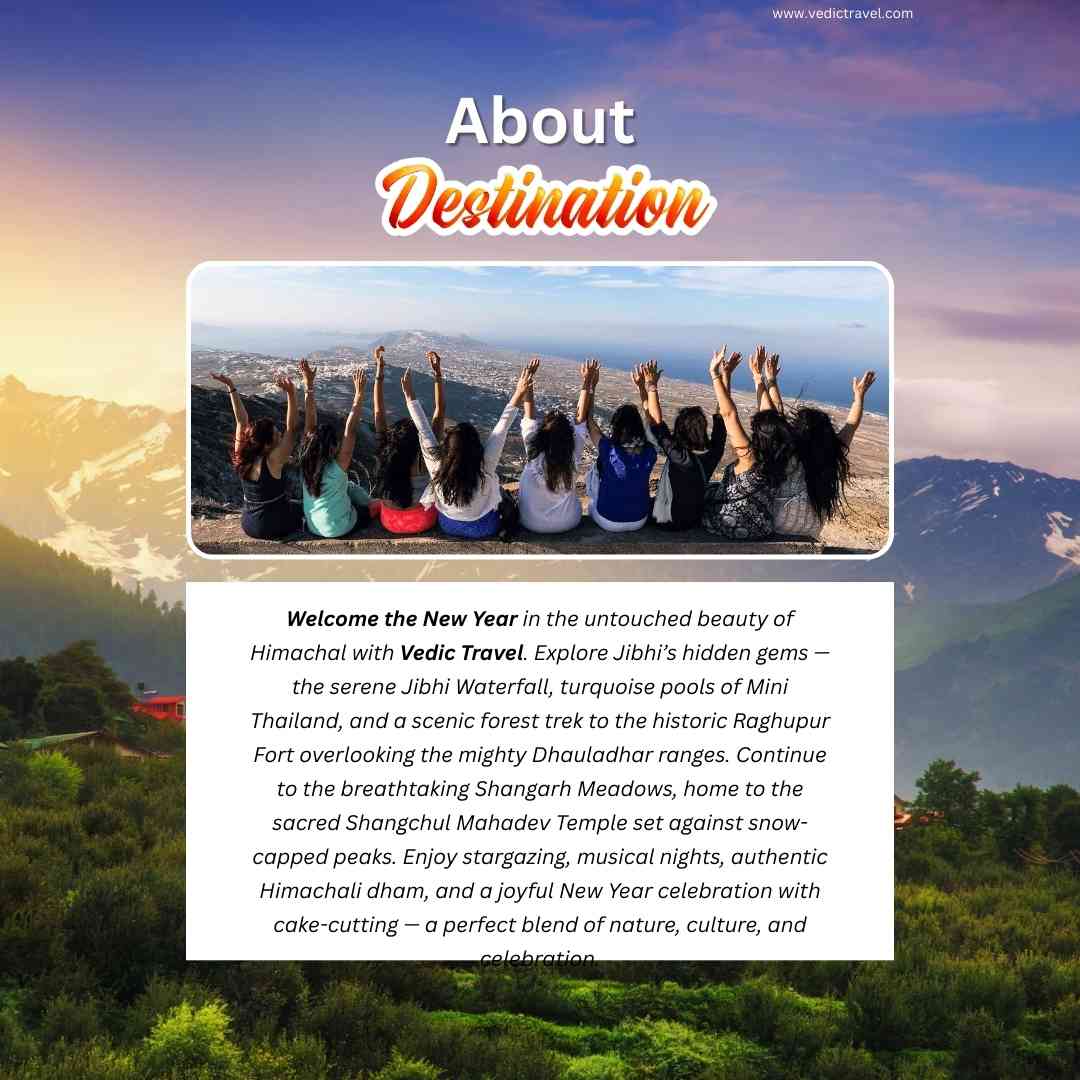 Welcome the New Year in the untouched beauty of Himachal with Vedic Travel. Explore Jibhi’s hidden gems — the serene Jibhi Waterfall, turquoise pools of Mini Thailand, and a scenic forest trek to the historic Raghupur Fort overlooking the mighty Dhauladhar ranges. Continue to the breathtaking Shangarh Meadows, home to the sacred Shangchul Mahadev Temple set against snow-capped peaks. Enjoy stargazing, musical nights, authentic Himachali dham, and a joyful New Year celebration with a cake-cutting and a perfect blend of nature, culture, and celebration.