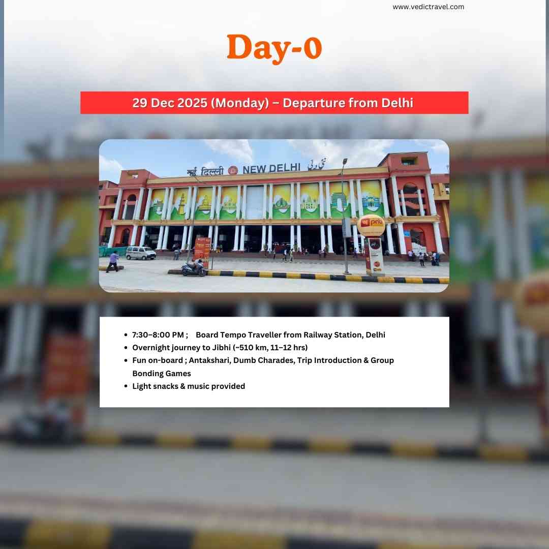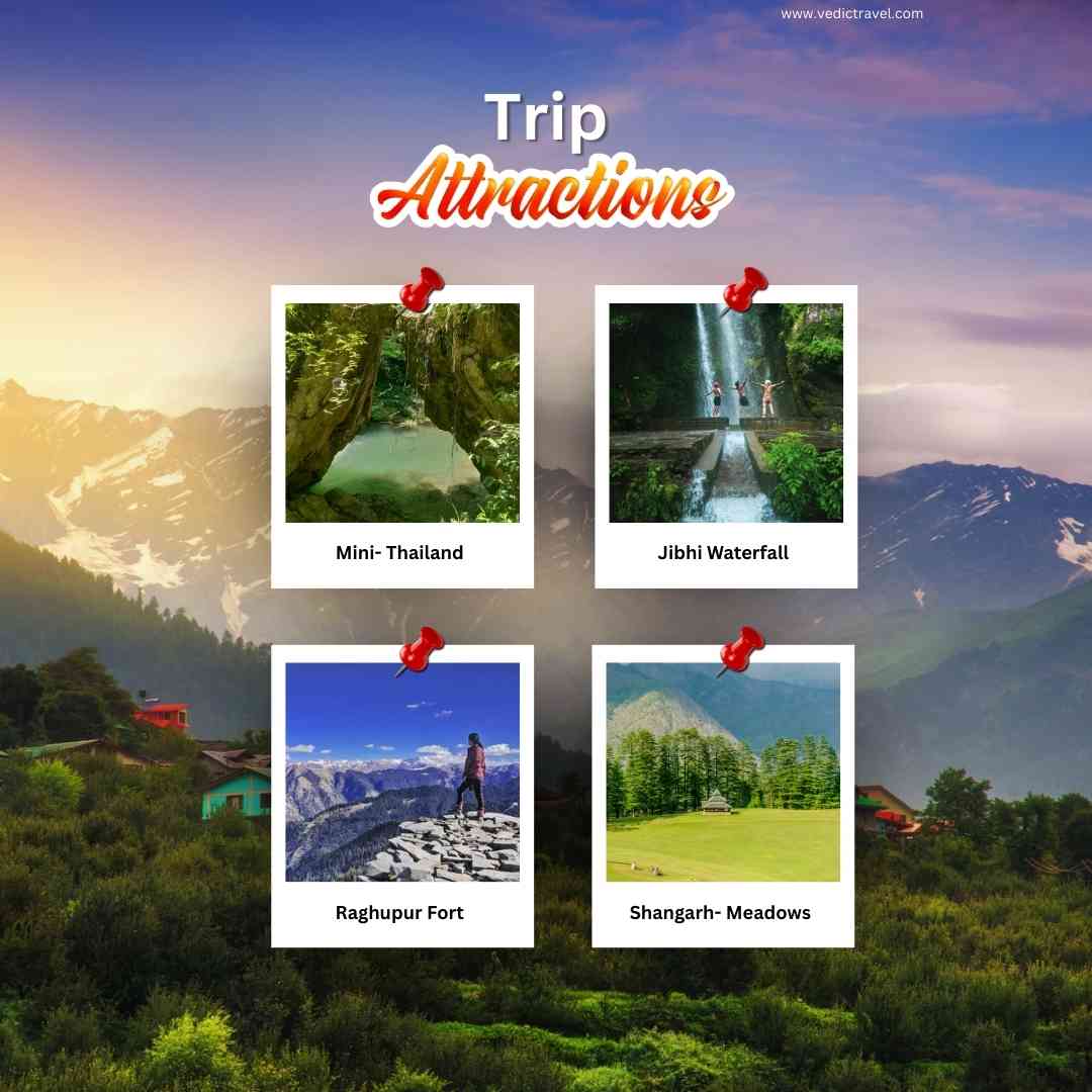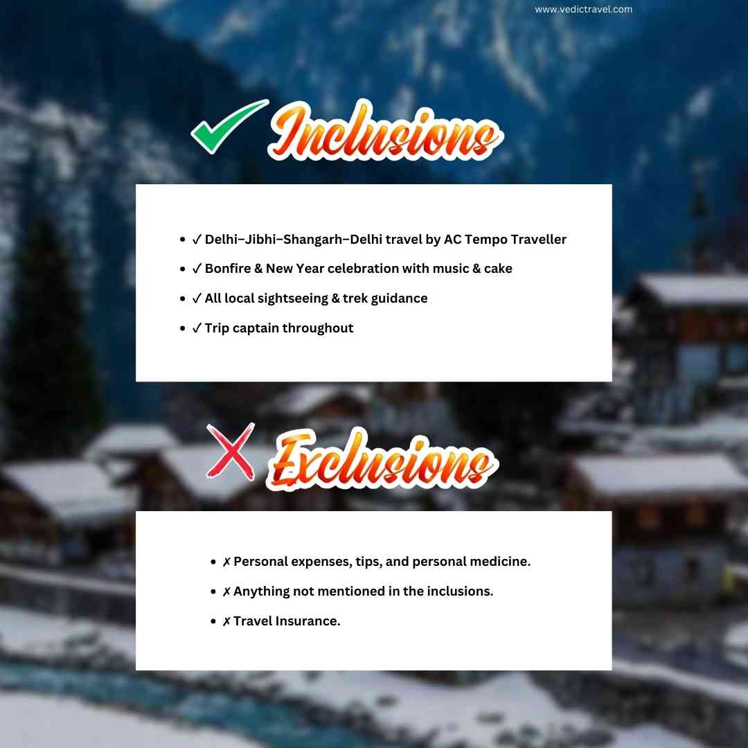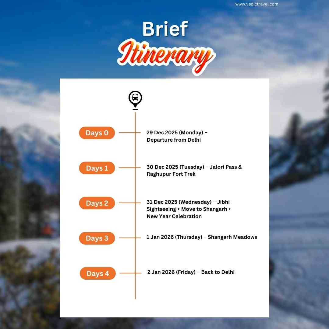 Welcome the New Year in the untouched beauty of Himachal with Vedic Travel. Explore Jibhi’s hidden gems — the serene Jibhi Waterfall, turquoise pools of Mini Thailand, and a scenic forest trek to the historic Raghupur Fort overlooking the mighty Dhauladhar ranges. Continue to the breathtaking Shangarh Meadows, home to the sacred Shangchul Mahadev Temple set against snow-capped peaks. Enjoy stargazing, musical nights, authentic Himachali dham, and a joyful New Year celebration with a cake-cutting and a perfect blend of nature, culture, and celebration.
